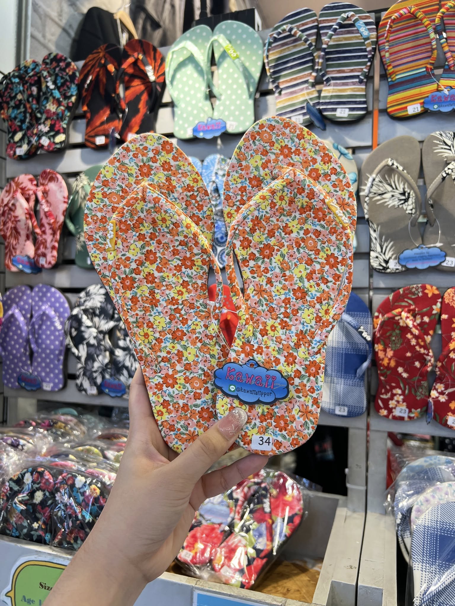 รองเท้าแตะkawaii slipper beach เป็นรองเท้าแตะที่มีเอกลักษณ์เป็นของตัวเอง เป็นงานกิ่งแอนด์เมดส่วนลวดลายด้านบนเป็นผ้าcotton 100% มีลายมากกว่า100ลายให้ลูกค้าหน้าร้านได้เลือกหา วัสดุพื้นล่างออกแบบและผลิตจากEVA