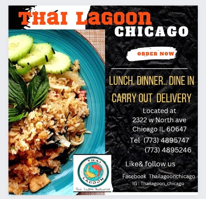 Thailagoon Chicago is a Thai restaurant in Chicago, Illinois. It is known for offering authentic Thai food in a casual dining setting with a warm, tropical-inspired ambiance. They serve classic dishes like Pad Thai, curries, and stir-fries, and they are also a BYOB (Bring Your Own Bottle) establishment, allowing guests to bring their own drinks.